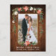 Rustic Wood Elegant Watercolor Winter Floral Wood Newlywed Photo Merry Christmas Card includes beautiful watercolor red poinsettias, botanical greenery, winter foliage, holly berries, white roses, cotton, pine cones and blue berries. Rustic Country Wood. Gold Frame.