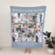 A custom dusty blue keepsake blanket for newlyweds featuring a 30 photo collage of your engagement, wedding day, bridal party, groomsmen, family, honeymoon, etc., and "Happily Ever After," your names and wedding date in elegant white serif typography.