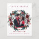 Winter rustic modern wedding thank you photo card with white and red burgundy trendy watercolor peony roses and blooms wreath with seasonal pine hunter green fir branches and holly berries over a clear white background.++++++++ Personalize it with 2 photos (one square on the front side and one landscape on the reverse), with your signature, sender address, and text on front and back! +++++++++++++ An elegant way of giving thanks and sending love for a winter Christmas wedding or sending greetings as a newlyweds couple.