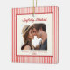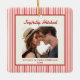 For the couple who are spending their first Christmas together as a married couple who deserve to mark this special time with a lovely Christmas tree ornament. This tree ornament can be personalised with the inclusion of a special couple's photo, and your married name and year on the front. The text on the back can be kept as-is or edited for text of an equivalent length. The design features a modern vintage twist with its candy cane stripes and pretty red bow on the back. Purchase with the optional pouch or use your own gift wrap for the happy couple but either way, this newlyweds tree ornament is sure to bring a smile to the faces of the super cute newlyweds.