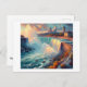 Vibrant swirls and vivid colors depict a waterfall beside a bustling city. The scene captures the dynamic interplay of nature and urban life, with immense energy and movement.