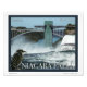A digital painting of the international bridge and observation tower at Niagara Falls, New York. With the horseshoe waterfall flowing quickly down into the river below, it sends water up into the air. A black-crownded night heron is in the bottom corner next to the white lettering, "Niagara Falls". At the top corners of the painting in white lettering is, "Canada" and "New York", showing which side of the gorge is who's. The painting has a dark blue border. Image Copyright ©2023 Kimberly J Tilley.