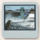 A digital painting of the international bridge and observation tower at Niagara Falls, New York. With the horseshoe waterfall flowing quickly down into the river below, it sends water up into the air. A black-crownded night heron is in the bottom corner next to the white lettering, "Niagara Falls". At the top corners of the painting in white lettering is, "Canada" and "New York", showing which side of the gorge is who's. The painting has a dark blue border. Image Copyright ©2023 Kimberly J Tilley.