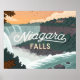 This retro-inspired illustration captures the dramatic power of Niagara Falls with cascading white water, teal river currents, and misty spray framed by lush greenery. Warm sunset skies and bold typography create a classic travel-poster feel, blending vintage charm with modern clarity. Textured details and balanced composition make this artwork perfect for fans of iconic landmarks, scenic destinations, and timeless travel-inspired illustration.