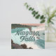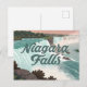This vintage-inspired illustration showcases the majesty of Niagara Falls with cascading turquoise and white waters, frothy spray, and rocky foregrounds adorned with wildflowers. Lush green forests and a warm sunset sky complete the scene, giving it a timeless and inviting feel. Decorative, dark teal lettering highlights the landmark, making this design perfect for fans of scenic travel art, classic landscapes, and iconic waterfall illustrations.