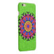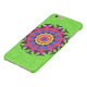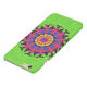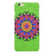A green background with a stylish colourful art in the middle. You have blue circle in the middle with a red almost circle around it with yellow dots inside the red circle. A Yellow circle around there again with shapes in the colour blue, red, pink and black around there again. You can also customise it to get a more personal look.