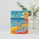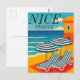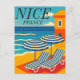 Soak up the sun on the French Riviera with this stunning Nice France travel postcard! This captivating illustrated design features a vibrant beach scene with iconic striped umbrellas and loungers set against the shimmering blue Mediterranean Sea. The charming coastal architecture and bright skies perfectly capture the allure of Nice.