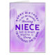 Wish your Niece a happy birthday with this unique typography badge style card, featuring the message, "Happy birthday to my incredibly amazing NIECE. She is brave, beautiful and strong. I'm so proud she is mine." White type appears on purple floral background with white frame.