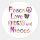 Share the love for your niece with this colourful design with a peace sign, heart, and the words Peace Love Hugs and Nieces.