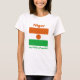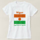 On the front of this shirt an editable title and slogan accompanies the Nigerien flag with its orange circle on white between orange and green horizontal bands. The back displays a detailed map of Niger.