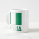 Giant coffee mug features the Nigerian flag with the word NIGERIA below in the same colours as the flag. Design shows on two sides of mug. Fun for travelers, as well as those who wish to honour their ancestry, culture and heritage. Great for reunions, travel groups and clubs