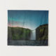 This photo features beautiful Skógafoss at night with stars and the northern lights.