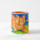Coffee Mug featuring Louis Wain’s animal painting Cat Stalking (1860-1939). An orange striped cat walks a green field at night. White, purple, and red flowers are in the foreground. A wonderful gift for cat lovers and English art.