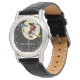Image of a beautiful lady witch flying on a broom together with her a black cat against the background of a yellow moon and two grey clouds. Text Night operations. Funny Women's Classic Black Leather Strap Watch. The impression of an aeroplane illuminator or viewport. Customisable. You can change the image, the dial and you can change or delete the template text. Have fun! The image is taken from the openclipart_org and is free for commercial use.