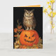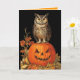 NIGHT OWL ON HALLOWEEN PUMPKIN AND AUTUMN LEAVES CARD