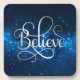 This dramatic and elegant drink coaster is beautiful during the Christmas season, but can be appropriate for all year long. It features silver script that says "Believe" against a blue night sky with glowing blue stars. Pretty!