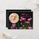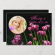 A dramatic invitation featuring hot pink tulips with white tips and a circular photo window for your favourite photo against a black background.