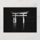 Black and white photo of the big torii standing in the sea at Itsukushima Shrine on Miyajima Island at night.