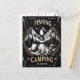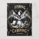 A black and white illustration depicting a tranquil camping scene with a tent, a campfire, and a fishing rod against a backdrop of mountains and a full moon. The text Fishing and Camping Go Together is superimposed over the illustration.