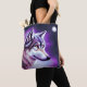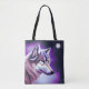 This is a beautiful tote bag for a wolf lover featuring an illustration of a mystical wolf face profile in white and shades of purple and blue.