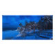 Nighttime winter scene with snow covered pine forest in a moon light at starry night. Panoramic view of coniferous forest with wooden pathway near sea coast against beautiful night sky with stars