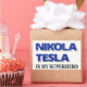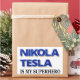 Nikola Tesla is my superhero. Text graphic in black and blue with white lightning.