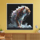 The image portrays a highly stylized and artistic rendition of a leopard made out of water. Water droplets and ripples form the shape and texture of the animal. The leopard appears to be in mid-stride and its body is composed of vibrant blues, purples and oranges that mimic its natural fur pattern. The dark background accentuates the vivid colors, giving the impression that the leopard is emerging from a void. This creative interpretation of an animal using water elements creates a dynamic and visually striking piece of art.