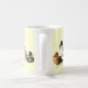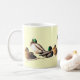 Nine mallard ducks decorate this lovely mug. The males have iridescent green heads, mostly white bodies and yellow beaks. The female's feathers are shades of brown and gold with orange beaks. Set on a creamy background with a green border that matches the male plumage, this is a striking design!