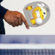 Do you bring the heat to your ping pong matches? This fun design features a yellow happy face ready for battle with ninja accessories.