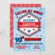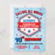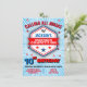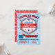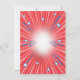 Poster style Ninja Warrior birthday party invitation with shield, stars, sunburst background and red, white and blue colours.
