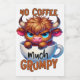 A funny and sarcastic colourful design showcases an adorable highland cow perched in an empty coffee cup. With a grumpy expression, big blue eyes, and brown fur, the cow adds a charming touch. The vibrant text reads, "No coffee much grumpy." This design is featured on a variety of products, making it a perfect gift for coffee enthusiasts.