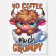 A funny and sarcastic colourful design showcases an adorable highland cow perched in an empty coffee cup. With a grumpy expression, big blue eyes, and brown fur, the cow adds a charming touch. The vibrant text reads, "No coffee much grumpy." This design is featured on a variety of products, making it a perfect gift for coffee enthusiasts.