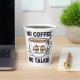 A cartoon cup of coffee with sleepy eyes, holding a "Do Not Disturb" sign, accompanied by the text "No Coffee, No Talkie." The cup appears exhausted, signaling the importance of coffee before engaging in conversation.