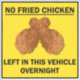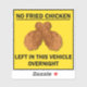Funny anti-theft warning sign van and car sticker with the wording 'no fried chicken left in vehicle overnight'. Perfect for takeaway delivery drivers and any white van man
