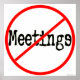 No Meetings sarcastic office humour slogan in distorted letters with a red circle and a line. Don't get trapped in a meeting at work, show them how you really feel with this funny saying.
