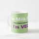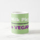 Mug especially designed for the vegan to use at work! Message reads 'No Milk Please I'm Vegan'. Remind work colleagues or your friends that they should not add milk to your tea or coffee! Text is white and purple on a green background. The background colour can be changed if desired. All text is template text and can easily be edited to a message of your own choice. Great mug to buy for your vegan friend!