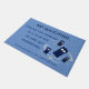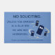 The opportunity for a science fiction fan to have a little fun with solicitors. Blue police boxes and a no soliciting message on a blue background. Original design by Night Owl's Menagerie 2019.