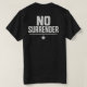Wide block letters “No Surrender” with a cracked texture through each letter. Underneath, a thin line and a small star complete the composition, all presented with negative space on solid black.