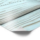 Weathered wooden planks are painted light aqua blue, creating a rustic and serene appearance with "no wake zone" text.