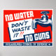 This vintage World War II poster features a giant water tap. It reads, "No water, No guns, Don't waste it!! Philadelphia Council Of Defence". Celebrate WW2 History with this digitally restored vintage war poster from The War Is Hell Store.