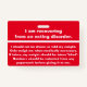 A useful tool to convey to providers that you are in recovery from an eating disorder and cannot know your own weight. This badge can easily be handed to, or seen by, a nurse or provider as a non-verbal reminder to not weigh you (or to not share with you those weight numbers). This product is suitable to be worn or kept in a wallet. This product is double sided.