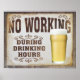 A vintage look poster featuring a foamy glass of beer and says " No working during drinking hours". An entertaining, fun poster.