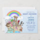 Delight the mum to be with this blue Noah's ark baby shower invitation. The blue colour is perfect for boys. The colourful graphic has the boat with all the animals looking out. There are two by two, giraffes, elephants, zebras, and more adorable animals.There is a rainbow and clouds at the top, and fish swimming around at the bottom .