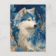 This ethereal postcard features a majestic wolf with white and cerulean blue fur, looking thoughtfully to the side. The artwork is characterized by intricate, feather-like linework throughout the wolf's coat, set against a star-studded midnight indigo background. Surrounded by vibrant blue blossoms and tall, golden wheat-like stalks, the piece creates a serene and mystical atmosphere. The rich palette of navy, sapphire, and cream provides a sophisticated, artistic vibe. As a postcard, it is perfect for sending a soulful message or as a unique piece of miniature wall art for nature and wildlife enthusiasts.