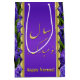 Noble, elegant Persian New Year illustration: Purple-gold border on a hyacinth fower field with New Year wishes in english and farsi.