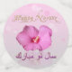 Noble, elegant Persian New Year illustration: A pink hibiscus bloom with New Year wishes in english and farsi on a bokeh background.