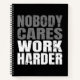 Stay inspired and motivated with our 'Nobody Cares, Work Harder' distressed text notebook. This isn't your average notebook; it's a daily companion for your thoughts, ideas, and goals. The rugged, distressed text on the cover adds a touch of style, while the powerful message inside serves as a constant reminder to push yourself further. Whether jotting down workout plans, motivational quotes, or personal reflections, this notebook is a perfect tool for your fitness journey.