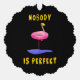The "Nobody is perfect" design, featuring a flamingo wearing a real swimming ring, is a humourous and playful depiction. This illustration emphasizes the fact that no one is perfect, but they can still have fun. The flamingo, an exotic bird, is usually associated with elegance and grace. However, in this design, his "imperfection" is humorously highlighted, as he relies on a swim ring to stay in the water instead of being able to swim perfectly himself.The real swimming ring reinforces the contrast between the normally expected elegance of the flamingo and its current situation.