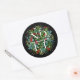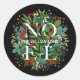 Personalised round stickers feature the word NOEL among elegant leaves and red, white and gold berries with your name and greeting in chic white lettering. MATCHING items in our store.