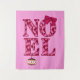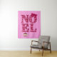 Tapestry in the greeting "Noel" patterned with retro modern Christmas trees in shades of burgundy and pink, embellished with a ribbon bow and a Christmas ornament